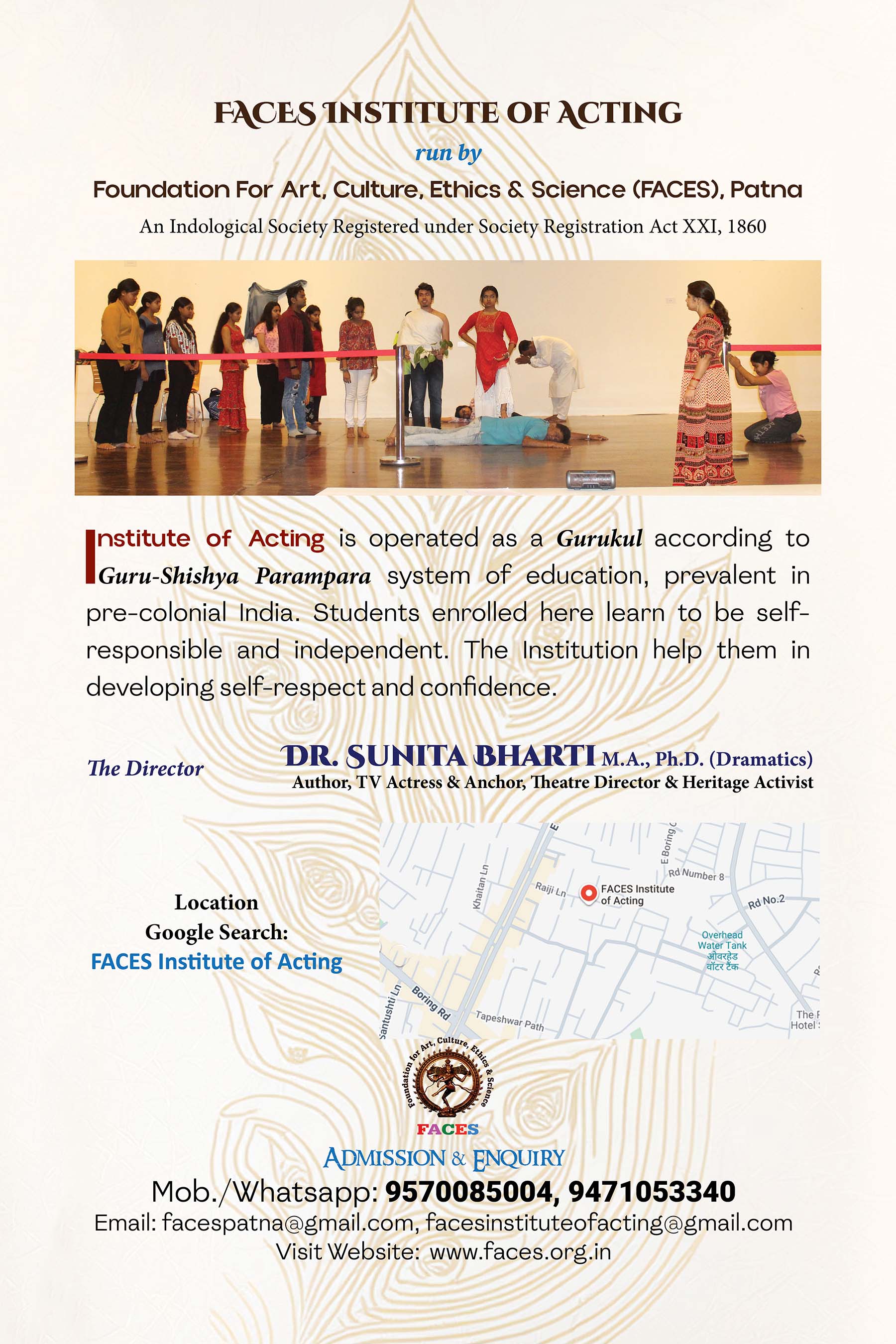 These condiderations reflect the awareness towards the role of theatre in pedagogy, but well before the release of NEP 2020, Dr. Sunita Bharti had started 'Theatre in Education' campaign in 2016 independently. She began producing a series of research based educational plays in the subject of social sciences, called Infodrama, which is a new genre of dramatic presentation, and designed to impart 'knowledge with entertainment'. Since 2016, the organization FACES (of which Dr. Bharti is Secretary) is staging the shows of Infodramas in schools, colleges and other educational/cultural institutions under its programme ‘Theatre in Campus’.