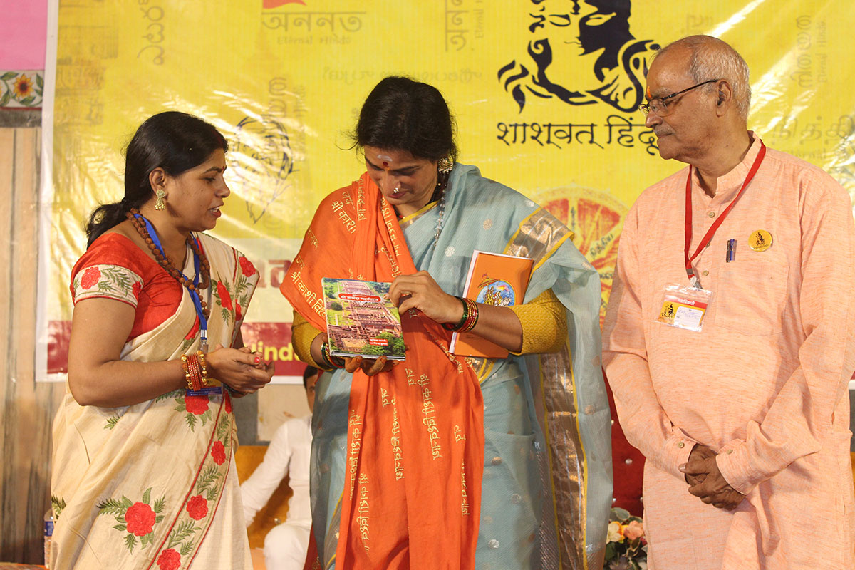 Dr. Madhavi Lata and Sri Chandranshu Ji Maharaj giving Ram Charit Manas to Sunita Bharti