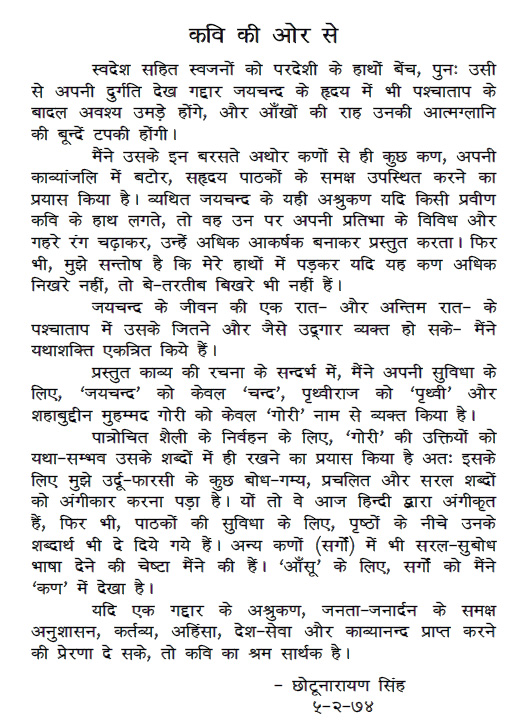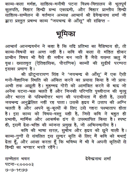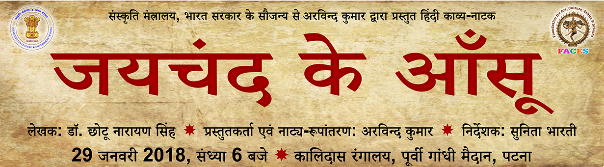 प्रस्तुतकर्ता : फेसेस (फाउंडेशन फॉर आर्ट कल्चर एथिक्स एंड साइंस), पटना।हिंदी काव्य प्रबंध की परंपरा में “जयचंद के आँसू” एक अद्भुत एवं विरल प्रयोग है। यह काव्य, ‘नायकों’ की स्तुति में लिखे गए प्रबंधों के उलट एक ‘खलनायक और देश-द्रोही’ के आत्म-ग्लानि की अभिव्यंजना है। लोक-श्रुति परंपरा के आधार पर लिखी गयी इस कृति की नाट्य प्रस्तुति का प्रधान उद्देश्य समाज, ख़ास कर युवा समाज में भारतीय संस्कृति के मूल विधायक तत्वों के साथ राष्ट्र प्रेम की भावना को संप्रेषित करना है।